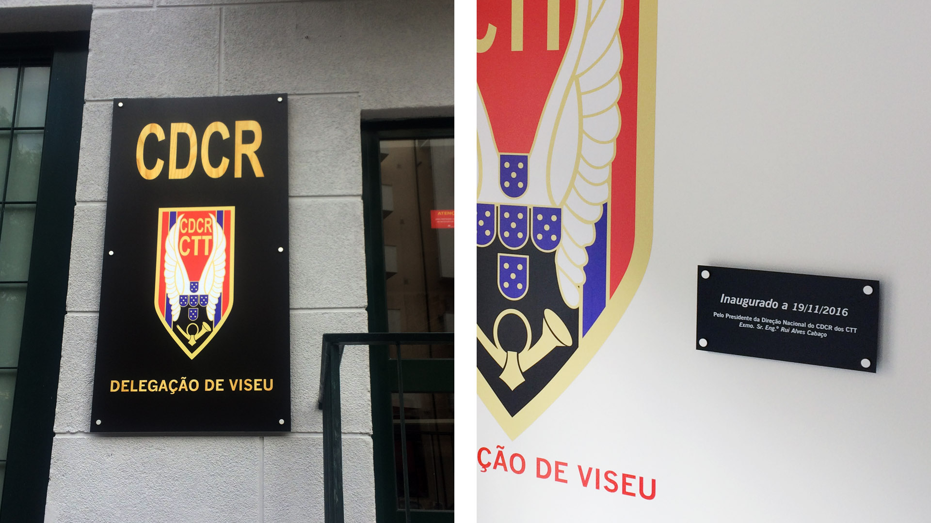 Placas em PVC expandido preto, aplicadas na parede através de afastadores. Vinil impresso laminado e vinil de corte contracolado.